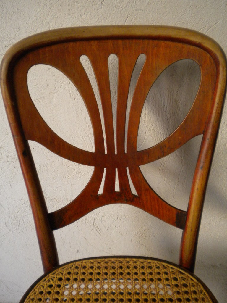 Las sillas de este segundo restaurante tienen un interés específico por la chapa calada del respaldo con un motivo que nos atrevemos a calificar de Secession. Son el modelo número 642 aparecidas en el catálogo de Hermanos Thonet (suplemento de junio) de 1907. El catálogo está publicado por Christopher Wilk, Thonet Bentwood and other Furniture. The 1904 illustrated catalog, N.Y.: Dover publications, 1980. Se trata en efecto de una silla con un diseño especial, bastante llamativo, de tipo floral-geométrico -quizá por esta característica no se utilizaba la imagen de este comedor para hacer propaganda del Hotel-. Por suerte tuvimos un ejemplar de esta silla en nuestras manos y podemos incluir una imagen detallada del diseño del respaldo.