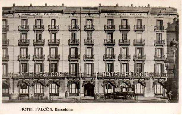 F. Vilaró Esponellá era un decorador importante en la Barcelona de principios de siglo XX, miembro de una saga de decoradores que acabaron encargando al arquitecto Sixte Illescas, miembro del GATCPAC, la primera casa racionalista de este país, terminada en 1929 (Avenida Coll del Portell, 67, Barcelona), llamada «Casa Vilaró». La cuestión que nos interesa aquí es que F. Vilaró intervino en la decoración de la reforma de la Fonda Falcon, transformada en Hotel, en 1912. Este Hotel era muy famoso en la Barcelona del primer tercio del siglo XX -hasta el POUM en los años treinta se instaló en él- , situado en la Rambla de los Estudios frente al Teatro Principal.