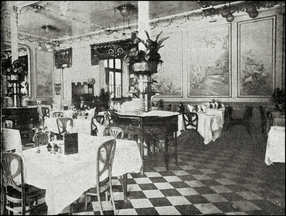 El Hotel Falcon reformado tenía dos comedores o restaurantes. La propaganda del Hotel escogió fotografías de uno de ellos -cuyo interior se reproduce arriba- para darse a conocer y existen en diversas publicaciones imágenes de tal comedor. Posiblemente las sillas eran las -un tanto anodinas- número 57 del catálogo de Hermanos Thonet, con asiento y respaldo -grande- de chapa calada perforada o con grabados. Pero el otro comedor tenía unas sillas diferentes, más atractivas a nuestro gusto. Esto lo hemos podido ver por un anuncio específico de F. Vilaró en la publicación Barcelona atracción de 1915 donde aparece una imagen que sólo puede ser del otro comedor del Hotel Falcon. Claro que el anuncio no lo dice pero se deduce de una comparación detenida de las fotografías de uno y otro comedor: se trata del mismo establecimiento.