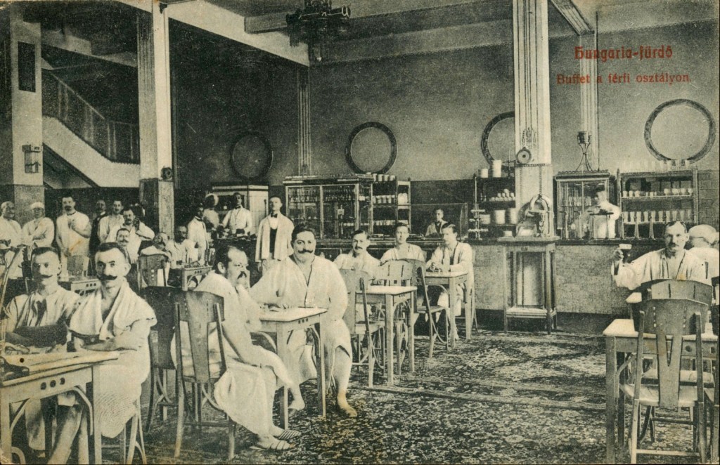 En este blog nos interesa especialmente el mobiliario, en su contexto. Existe una tarjeta postal del «buffet» o bar-restaurante de los baños, girada en 1910, donde pueden apreciarse unas mesas y unas sillas modernas del fabricante de madera curvada Hermanos Thonet. Son con toda seguridad de los años de la reforma del arquitecto Ágoston. Con respecto a la importancia de Hermanos Thonet en Budapest, nos remitimos a la entrada sobre Thonet y Kohn en Hungría de este mismo blog.