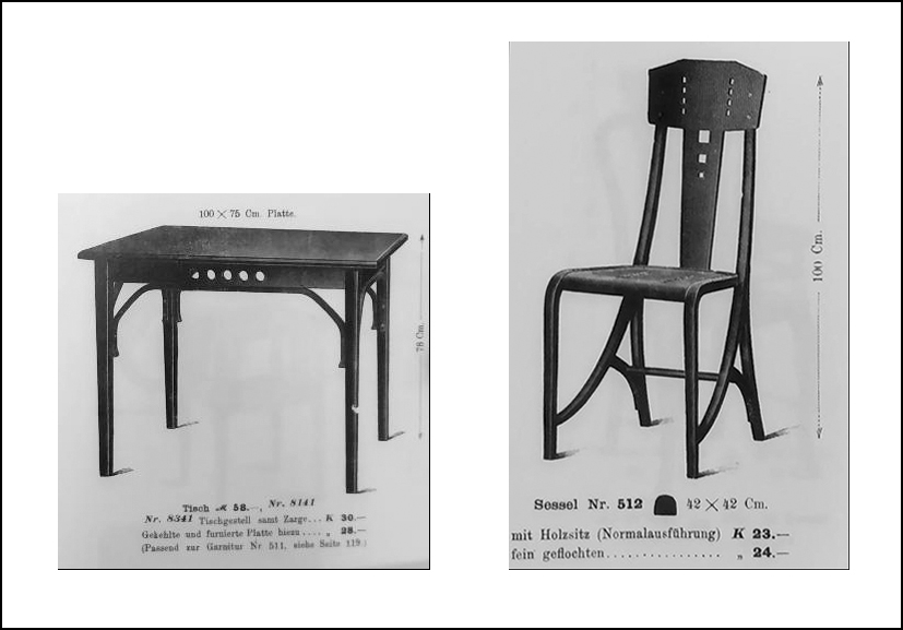 No puede pasar desapercibido el alineamiento estético de las mesas con las sillas. La mesa en cuestión aparecía frecuentemente en el catálogo junto al modelo de silla número 511 pues este también tenía unos círculos recortados en el respaldo y así emparejaban estéticamente. En efecto, las mesas del Hungaria Fürdö tienen una decoración en círculos que sintonizan con los cuadrados de las sillas y, específicamente, las piezas de refuerzo que unen las patas de las mesas con su correspondiente tablero están diseñadas -si se observa detenidamente- en la misma línea esquemática del respaldo de las sillas. En cuanto a su datación, el modelo de mesa se encuentra en el suplemento al catálogo de 1904 de 1905/1906 y la silla en el suplemento al catálogo de 1907. [Estos catálogos están editados por Christopher Wilk, Thonet Bentwood & other furniture. The 1904 illustrated catalogue, N.Y.: Dover publications, 1980]. No sabemos quién diseñó estas sillas ni si fueron escogidas por el arquitecto autor del proyecto pero quien fuera tenía un buen gusto modernista en materia de mueble curvado. Habitualmente había modelos brillantes en los catálogos de Hermanos Thonet, suficientes para que un arquitecto de la época escogiera uno del catálogo directamente, en vez de diseñarlo él mismo.