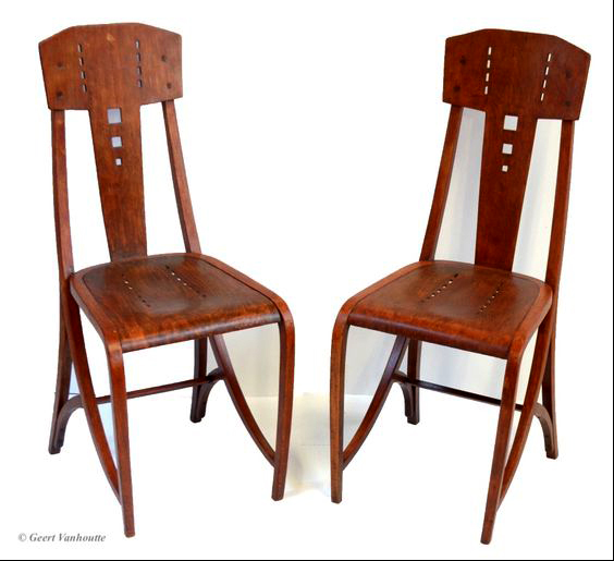 En la imagen de la postal se observa a los clientes -hombres, pues es la «división masculina del Buffet»- con sus albornoces sentados en ejemplares de la silla modernista nº 512 del fabricante de Viena. Se trata de un modelo derivado del 511, sobre el que también tenemos una entrada en este blog. Tienen ambos diseños en común el dibujo en diagonal de la estructura con un parecido significativo con sillas Art nouveau de principios de siglo XX y por eso pueden calificarse de modelos Art nouveau. La particularidad del modelo 512 respecto al 511 es el diseño del respaldo – y en menor medida también del asiento- que sigue, en el 512, unos patrones geométricos que evocan el Glasgow Style. No descubrimos nada si recordamos que la Secession vienesa tiene atributos en lo estético -y también en lo sentimental- de los artistas de Glasgow, especialmente Charles Rennie Mackintosh y Margaret Macdonald. Al parecer, el modelo nº 512 se encuentra de tanto en tanto en el Reino Unido, quizá por el atractivo de esa decoración de cuadrícula de la chapa del respaldo.