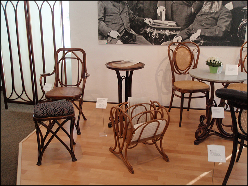 Como hemos señalado, existía este diseño de las patas en diagonal en otros muebles. En la fotografía que adjuntamos, del Museo de la Ciudad de Boppard, -anterior a la reforma de la museografía-, puede verse el sillón y el taburete del modelo número 51.