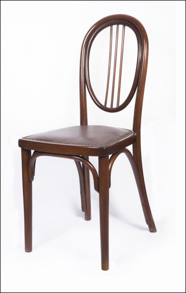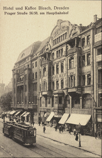 El Café Blesch de Dresde estaba en la céntrica Prager Strasse 56/58, al lado de la Estación central. Circulan numerosas tarjetas postales del interior del café, de las que habíamos adquirido algunas porque se veían unas sillas de madera curvada atractivas, con un respaldo ovalado y tres barritas verticales cruzándolo. Pensábamos que era una silla de los años veinte que aparece como número 644/1 en un catálogo de «Thonet Frères». El modelo 644 a secas designa la popular silla de Josef Hoffmann con cinco barritas verticales en el respaldo. Dicho sea de paso, el contenido del catálogo se presentaba como «Muebles Tchéco-slovaques en bois courbé Thonet«, dato que indica claramente su datación después de 1918 con la creación de dicho Estado nacido de la disolución del Imperio Austro-Húngaro al final de la Primera Guerra Mundial. «Thonet Frères» era la filial en Francia en esos años. En el catálogo de Thonet de 1928 la numeración pasa a ser 643/I ofreciéndose también en formato de sillón. La cuestión está en que por las fechas en que se giraron las postales de referencia -1914/1925- las sillas deben haber estado disponibles en el mercado antes de la Primera Guerra Mundial y el café dotarse de ellas como más tarde en 1914. Pero no hemos encontrado el modelo en ningún catálogo anterior a 1920.