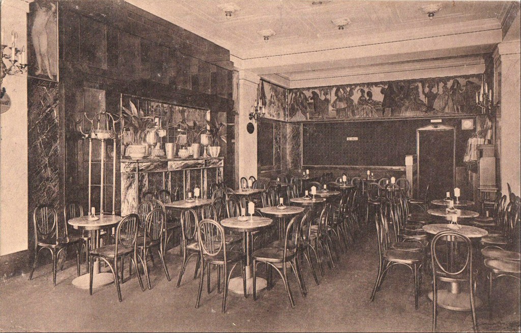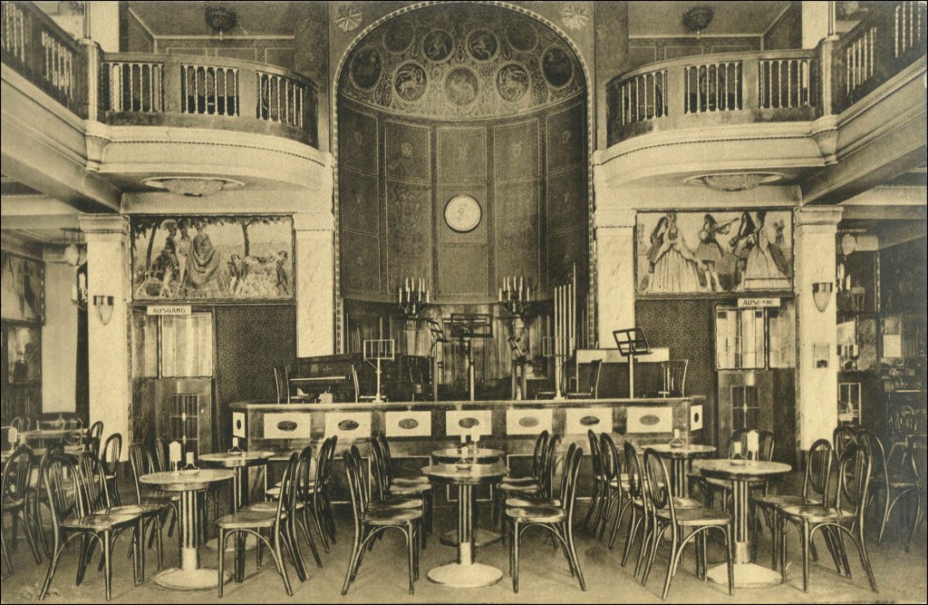 De este Café casi no hemos encontrado información en internet más allá de las postales disponibles sólo que en los años treinta era el «Hotel Canadá». Pero con toda seguridad el edificio fue destruido en el bombardeo de Dresde, en 1945, como parte del centro histórico de la ciudad. Las postales del Café muestran unos interiores espectaculares, con frisos decorados con escenas y un espacio para los músicos de dimensión teatral. La impresión que dan los interiores con los que las sillas armonizan, es «intensamente déco», si se permite la expresión.