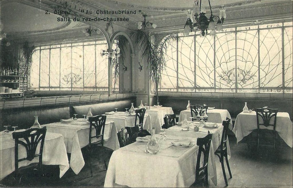 El Hotel-restaurant «au Chateaubriant» (acabado en «t» tal como ponía en el toldo de la terraza en una época o con «d» en algunas postales), estaba en la Avenue de la gare, nº 3 de la ciudad de Dijon, enfrente de la estación, después Avenida Maréchal Foch. El establecimiento, después del 1900 tenía las sillas nº 293 del catálogo de Hermanos Thonet, aparecidas en 1901. La silla tenía un diseño del respaldo -en aquella época además de ser funcionales las sillas tenían que ser atractivas- que era una adaptación del popular y Art nouveau diseño de hoja de palmera pero con aire Secession vienesa, más abstracto. Las sillas del restaurant llevaban arcos en vez de anillo entre las patas, lo cual era una posibilidad opcional prevista en el mismo catálogo de venta. Al margen de las sillas sólo podemos especular que es muy posible que el imperial filete au chateaubriand se sirviera con la buena mostaza del lugar. ¿Cómo se servirá hoy?