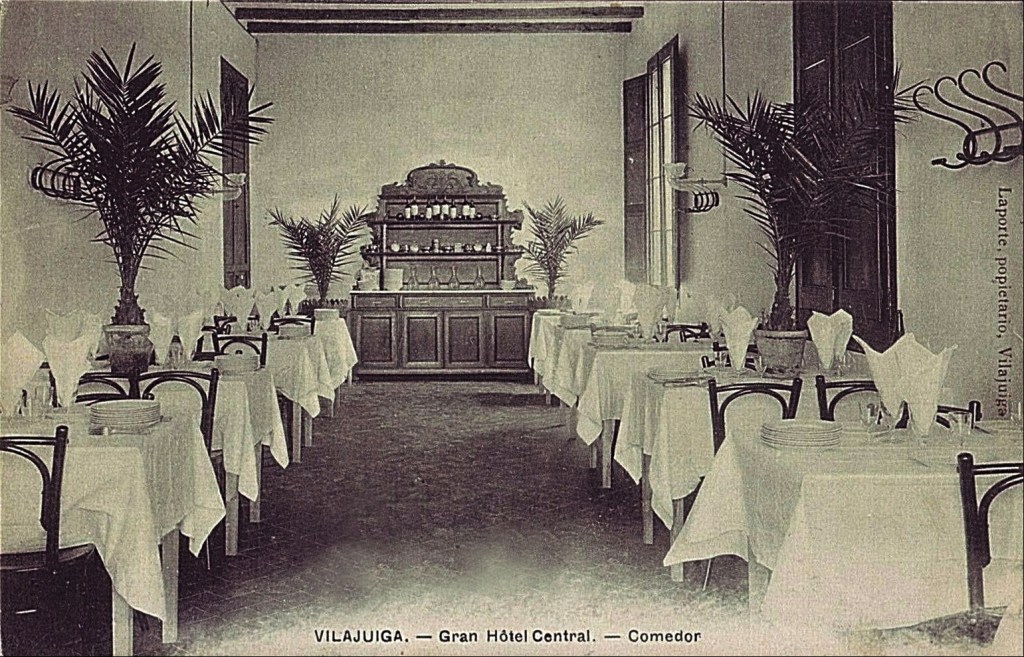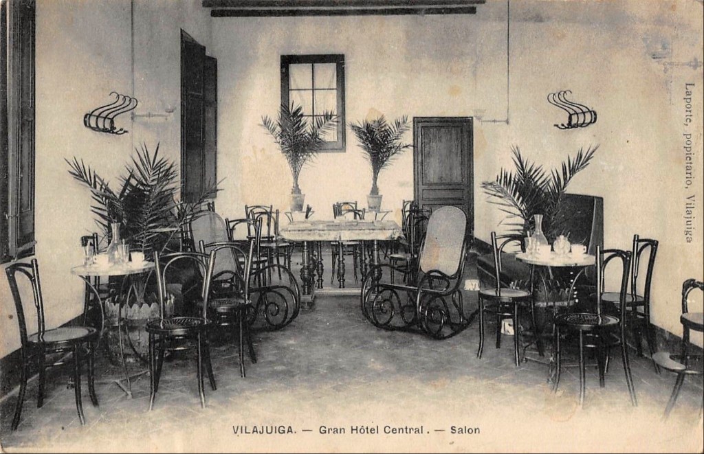 Vilajuïga es una localidad bien conocida de Girona, en particular por la calidad de sus aguas medicinales, actualmente promocionadas por muchos chefs de prestigio. El Hotel Central, inaugurado en 1908, como la Fonda Europa, para acoger a los visitantes bebedores del agua de Vilajuïga, tenía su temporada «oficial» del 1 de abril al 30 de octubre, aunque estaba abierto todo el año. Su propietario era Sebastián Laporte y así constaba en los anuncios en La Vanguardia y en las postales del hotel que se editaron. El nombre «Gran Hotel Central» era un tanto pretencioso teniendo en cuenta su tamaño reducido. No obstante la fachada tenía un aire modernista que ayudaba a subir el nivel de un establecimiento apropiado para difundir las bondades del agua de Vilajuïga y atraer visitantes. En aquellos años el agua de Vilajuïga tenía gran difusión en los hoteles y restaurantes. De hecho, dicho sea de paso, se bebía en el restaurante del Hotel Buenos Aires de Vallvidrera como puede verse en una buena ampliación de la fotografía que hizo en su día Lucien Roisin del interior del establecimiento.