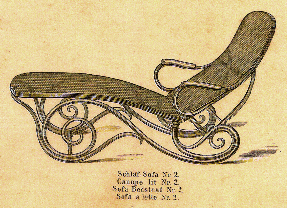 También se aprecia, examinando con detenimiento el grabado existente, que el sofá-cama estuvo a la vista del público en primera fila en la instalación de Hermanos Thonet en la Exposición universal de Barcelona de 1888.