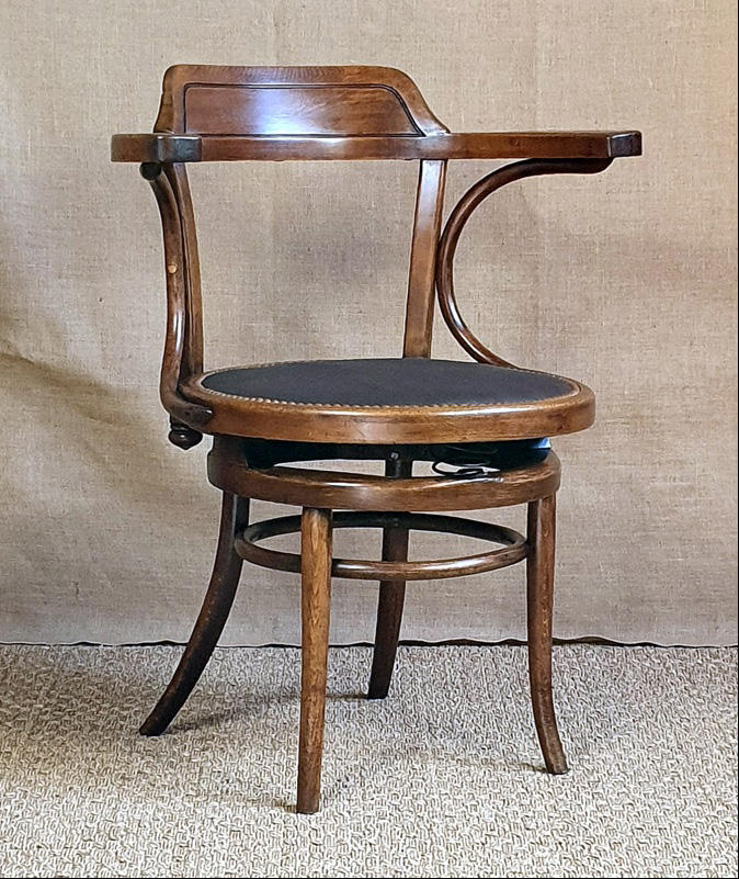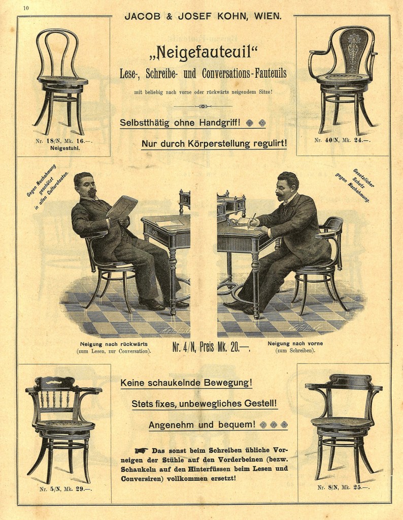 En la era de » la mecanización toma el mando» (Sigfried Giedion) y siguiendo las pautas de inventos similares en los Estados Unidos, la casa Kohn patentó -en todos los Estados, según se indica en los anuncios- en 1898 un sillón con asiento móvil y respaldo reclinable en consecuencia (Neige-fauteuil-fauteuil à bascule automatique) específicamente diseñado, según los usos de la época para «leer, escribir y conversar». Suponemos que no es que los otros sillones de escritorio de Kohn, por ejemplo el famoso sillón de escritorio «Le Corbusier» que fue introducido en el mercado por Kohn en 1899, no sirvieran para «leer, escribir y conversar» pero la búsqueda de la funcionalidad estricta y multiple, era un atractivo comercial. Se publicitaba sobre todo en revistas vienesas como Neues Wiener Journal (8 de diciembre de 1898) y Wiener Bilder (27 de noviembre de 1899).
