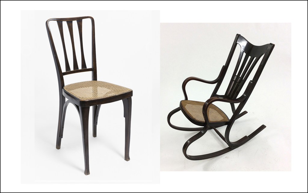 Siguiendo la estela de la casa Kohn, Thonet también hizo modelos de mecedora en estilo Secession y el nº 411 es un ejemplo destacable. Tiene cuatro derivaciones verticales en el respaldo en las que se intercalan tres barritas de bronce con una pequeña bola en sus extremos. El aspecto es decorativo y constructivo al mismo tiempo. Asimismo, hay un esfuerzo de continuidad lineal en la curvatura de la pieza del apoya-brazos y el balancín, con un efecto de ondulación que proporciona ligereza al diseño. La sección de las barras de madera es rectangular. Se trata de un modelo muy apreciado por los coleccionistas por su estilo, tan diferente de otras mecedoras más clásicas de Thonet.