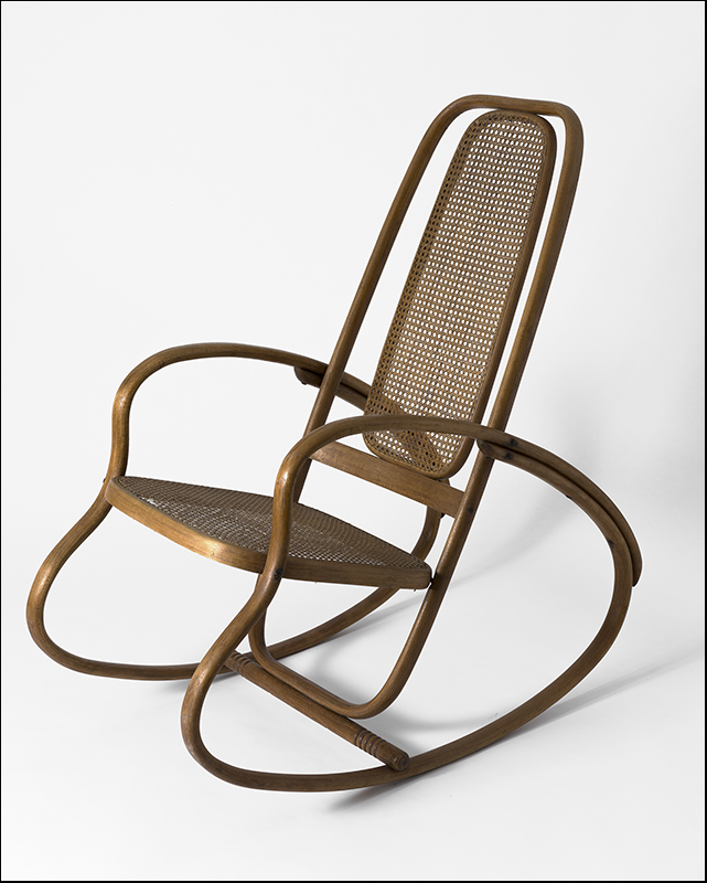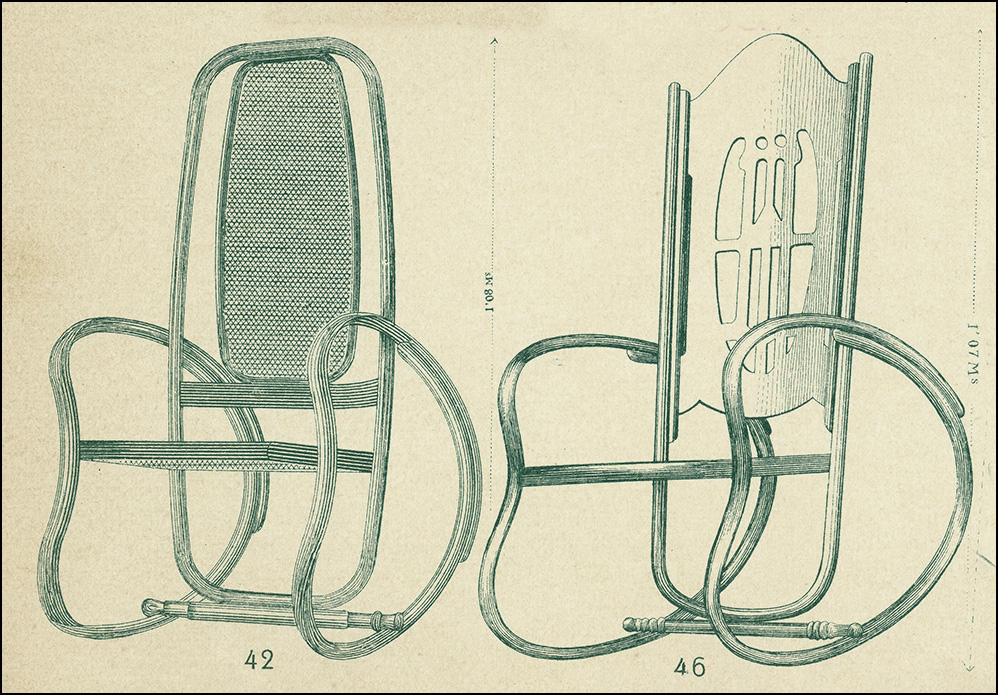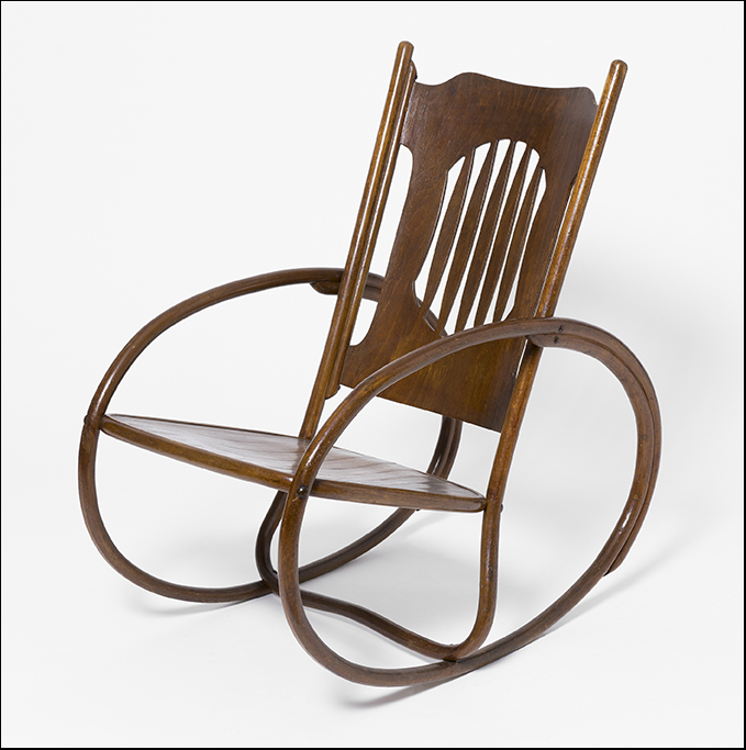 En el catálogo que se conoce de Luis Suay Bonora (Valencia), datado, aproximadamente, en 1910, aparece una mecedora moderna que es una pieza destacada del mueble curvado valenciano y que, en algún momento, ha sido calificada como una pieza «proto-racionalista» por su modernidad. Se desconoce el nombre del diseñador. Tenía diversas opciones decorativas -con rejilla o con chapa- pero la estructura, limpia y transparente, era la misma. Evidentemente, no carece de referentes: se trata de una adaptación y perfeccionamiento de una mecedora infantil del fabricante vienés Jacob & Josef Kohn y que suele atribuirse al genio de Gustav Siegel. Esta mecedora de Viena, de la que se conserva un ejemplar en el Museo Nacional de Artes Decorativas de Madrid, es de tamaño reducido y los laterales están formados por una sola pieza de forma ovalada. Lleva el número 827 del catálogo y salió a la luz en 1905, aproximadamente