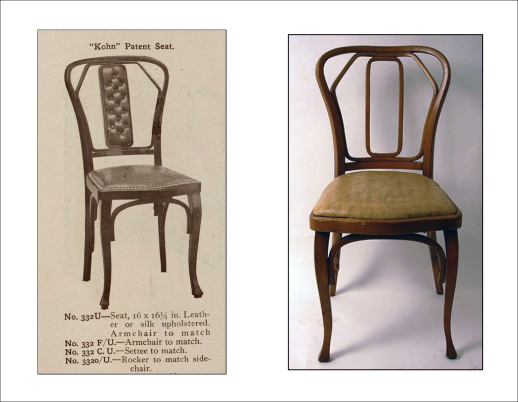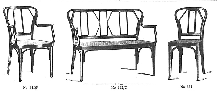 En el catálogo general de Kohn para Europa de 1906 aparece por primera vez el modelo 332. Como puede apreciarse, las patas delanteras son rectas, como el resto del diseño (salvo la pieza exterior del respaldo). El único elemento patentado es el asiento porque está construido en una sola pieza curvada en ángulo recto, una patente de Kohn de 1898 y que se tradujo en asientos y respaldos de varios modelos de la firma. Al curvar el asiento, para evitar compresiones y roturas, se hacía una incisión en la parte cóncava de la zona a curvar, eliminando material, lo que permitía la llamada «curvatura rectangular». En cambio, puede apreciarse en la fotografía anexa que, a pesar de sus formas geométricas, la pieza del interior del respaldo no está curvada en ángulo recto, aunque la curvatura sea de un grado bastante alto. El aspecto rectilíneo del mueble se hace patente en los sillones y el sofá con el diseño del apoyabrazos. Los refuerzos entre las patas son siempre arcos. Nunca hemos visto un sofá de este modelo.