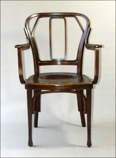 En 1906 apareció en el catálogo general de la firma Jacob & Josef Kohn un modelo de silla, sillón y sofá peculiar por el diseño geométrico del respaldo (rectángulo en vertical rodeado de un hexágono irregular), con las barras de madera de sección rectangular y una presencia más bien moderna para lo que era el tradicional mueble curvado vienés. No sabemos a ciencia cierta -es decir, con pruebas- quién fue el diseñador, cosa que pasa en bastantes muebles curvados de la época, pero aventuramos que es un diseño que puede atribuirse al director del departamento de diseño de Kohn, Gustav Siegel. En particular el diseño ondulado de la pieza exterior que forma las patas traseras y el respaldo es muy similar a otros diseños coetáneos de Siegel y que llevan una numeración próxima.