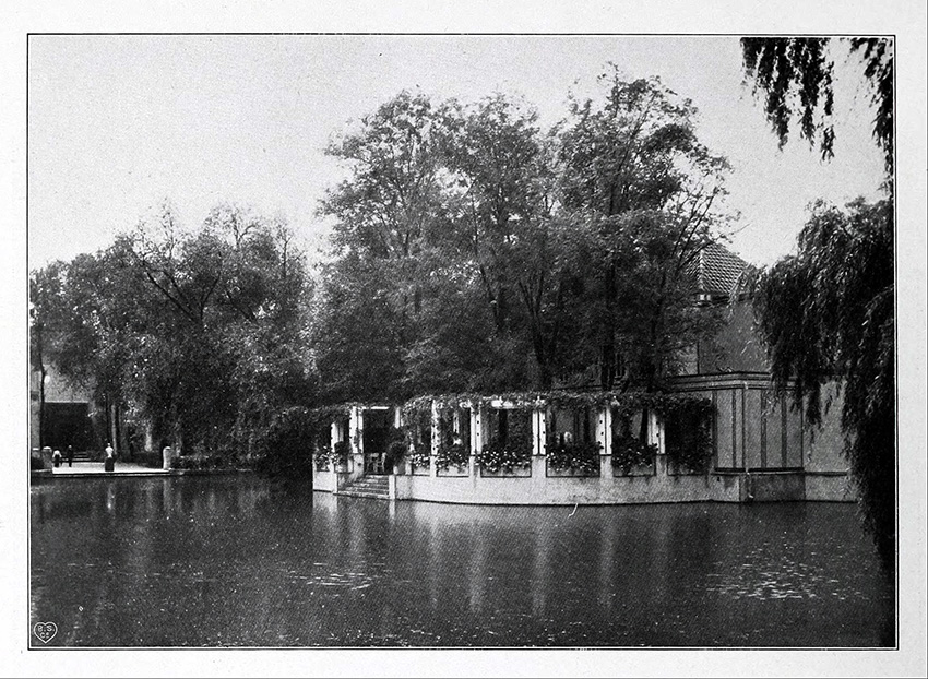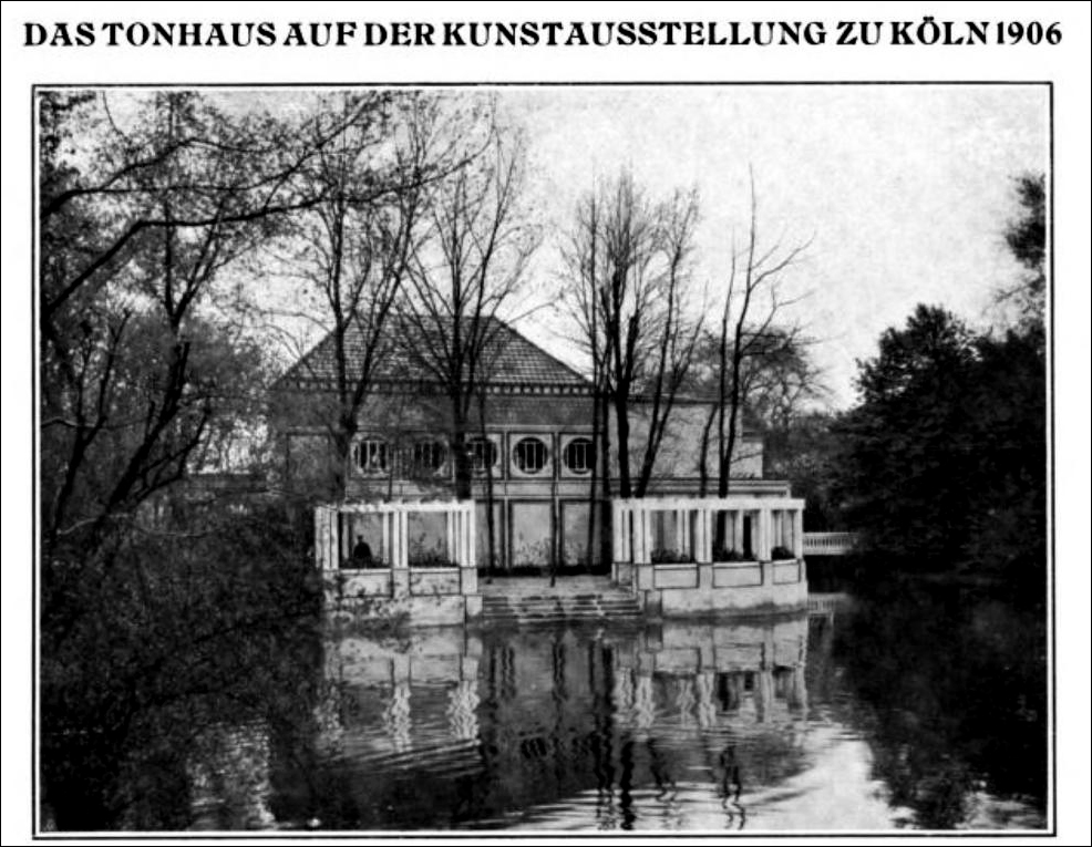 El famoso arquitecto autodidacta y diseñador industrial alemán Peter Behrens (Hamburgo, 1868- Berlín, 1940) construyó la sala de conciertos (Tonhaus: casa de la música, literalmente) en la exposición de arte alemán que tuvo lugar en Colonia en 1906, en el recinto del parque Flora. Es una obra menor de Behrens, desaparecida, que recogemos en este blog por los sillones de la firma de mueble de Viena Jacob & Josef Kohn que utilizó en el hall de la casa de la música. Es un edificio sencillo y sobrio, de formas geométricas, que evoca las iglesias primitivas de la Toscana, y tiene una pérgola adyacente construida frente a un estanque, tal como aparece en las fotografías y postales que se conocen. En la terraza había una fuente con esculturas del artista belga George Minne. El edificio de la casa de música es del estilo del más conocido Crematorium de la asociación para la incineración de Hagen en el cementerio de Delstern, también obra coetánea del arquitecto.