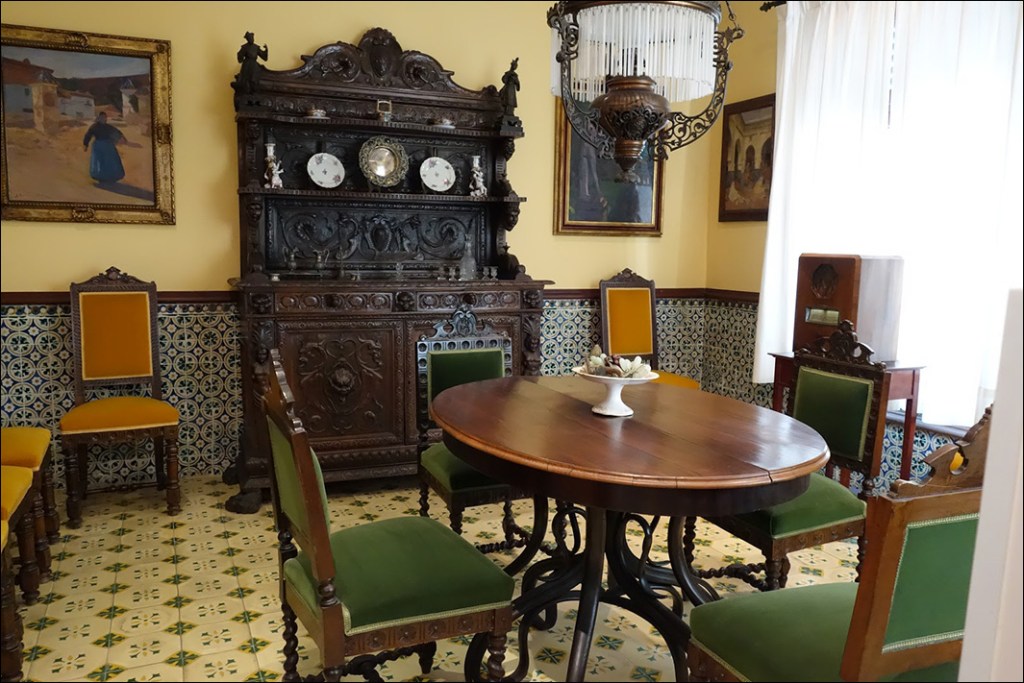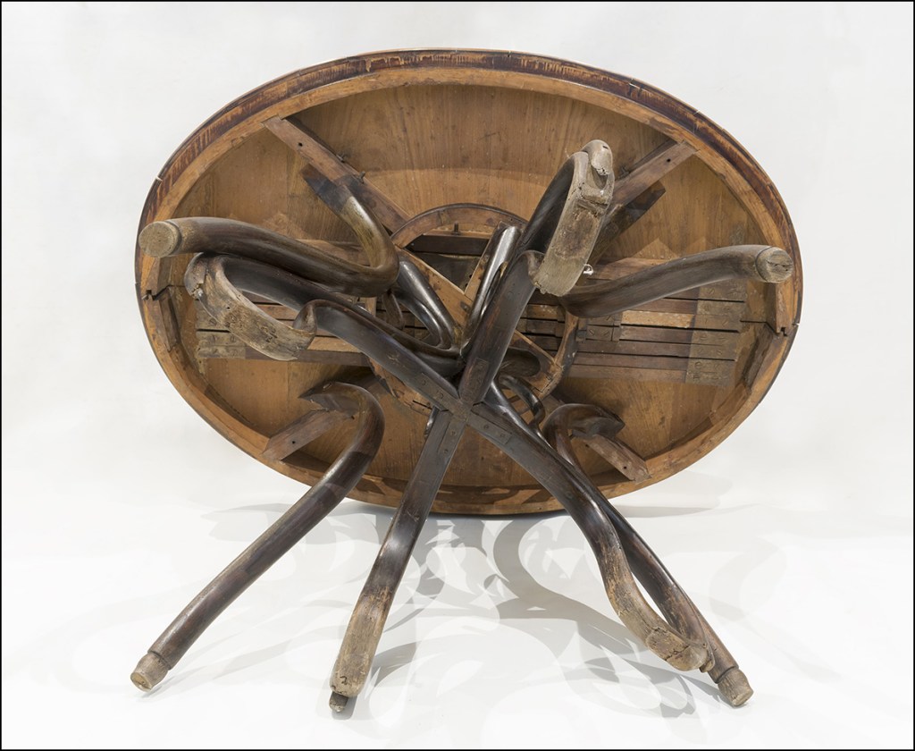 Por último, es de interés la mesa extensible número 3 de Hermanos Thonet que se encuentra en el comedor de la casa. Thonet ofrecía diversos modelos de mesas extensibles. En este caso se trata de la mesa número 3 del catálogo con sistema de apertura de compás, como se aprecia en la fotografía de la parte inferior de la mesa. Las mesas extensibles de Hermanos Thonet son muy raras y esta de la Casa Museo Benlliure es una pieza realmente especial.
