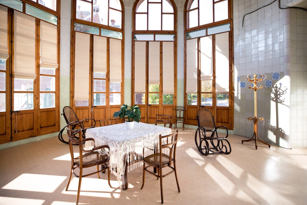 Per fotografies antigues se sap quins mobles hi havia al saló de visites de l’Hospital de Sant Pau. Els balancins eren el model «Exposició 1909» de Salvador Albacar. En la reconstrucció que es va fer fa uns anys van posar dos balancins semblants que són de Ventura Feliu i fills. El model utilitzat es pot veure al catàleg de 1924 -model núm. 3- del fabricant del carrer Sant Vicent. En qualsevol cas, l’ambient lleugerament corbat de l’època està bastant encertat, a parer meu.