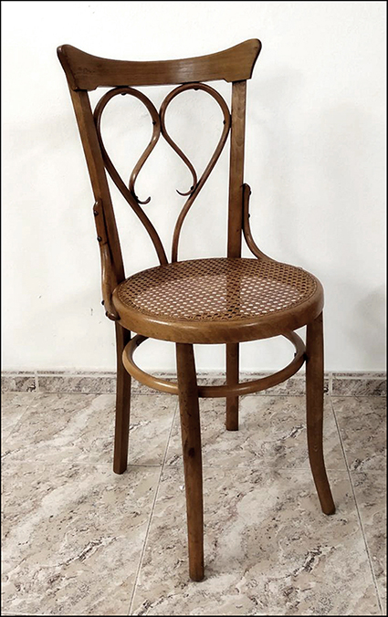 Totes dues imatges, entre els anys vint i trenta, mostren amb claredat unes cadires molt amables que, diríem, fins hi tot t’estimen, quan vens de l’exterior amb el vent gelat i el fred de la neu en el cos. Trobar-te amb aquestes cadires decorades amb un cor al respatller i voler asseure’t a menjar -i amb música de gramola- és la mateixa cosa. Del vi no cal dir res. Eren cadires de Vicent García Miralles, de València, el número 17 del seu catàleg. Aquest fabricant va estar molt actiu en els anys vint i trenta. Les cadires de Núria porten reforços laterals per a donar major solidesa a l’estructura. La col·lecció de moble corbat de la Fundació Caixa Vinaròs ha ingressat un exemplar amb seient de reixeta de la «cadira que t’estima», també amb reforços laterals, i que mostrem en una fotografia no professional. Deixem-nos estimar per aquestes boniques cadires del restaurant del Santuari de Núria.