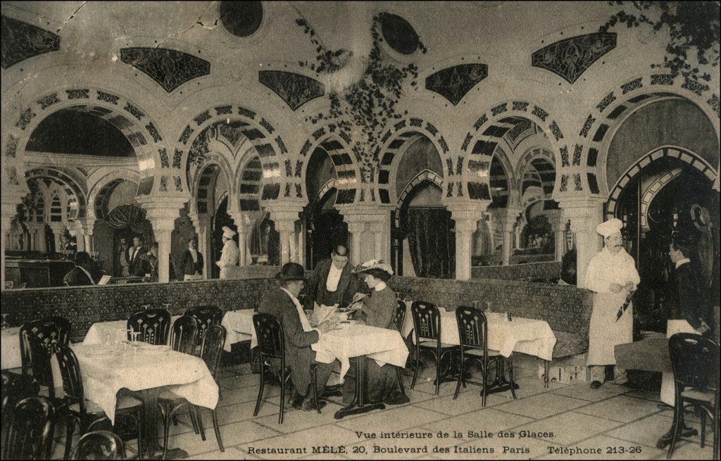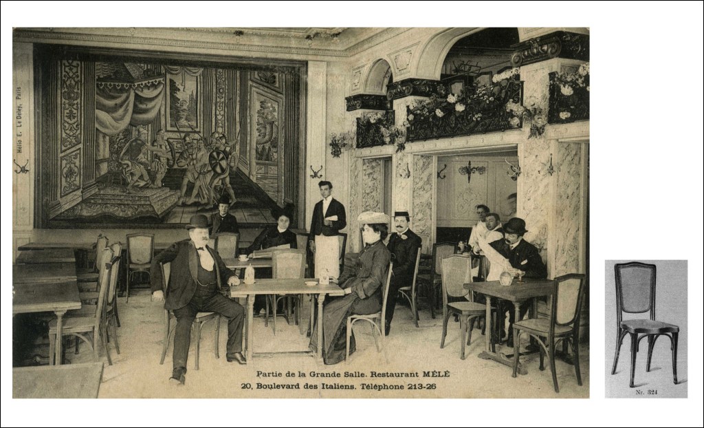 Realmente, este Boulevard de París tenía o había tenido establecimientos emblemáticos como el Café Poccardi (nº 9), el Café Anglais, (nº 13), el Cafe Riche (nº 16), la Maison Doré, cerrada en 1902 (nº 20), el Café Tortoni que cerró en 1893 (nº 22) y el Teatro de Novedades (nº 28), entre otros. Lo cierto es que en 1904 en el nº 20 del Boulevard, ocupando los antiguos locales de la Maison Doré, al lado de la antigua tienda de Kohn, se encontraba un Restaurante llamado Mèlé. Los rastros de este local se pierden en 1906, posiblemente por una quiebra de la empresa que lo gestionaba. Pero existen, al menos, dos postales de los interiores con mobiliario -qué coincidencia- de Kohn que, en aquellos años, ya no se podía adquirir en el nº 24 del Boulevard sino -un poco más lejos- en el nº 88 de l’Avenue Ledru Rollin.