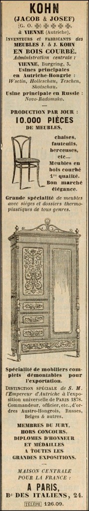 En el nº 24 del Boulevard des Italiens estaba la tienda de Jacob & Josef Kohn en París desde 1885, aproximadamente, hasta 1901, cuando se trasladó a la boutique-showroom Secession de l’Avenue Ledru Rollin en el cruce con la Rue du Faubourg Saint Antoine, establecimiento espectacular, decorado por artistas vieneses, sobre el que puede verse una entrada en este blog.