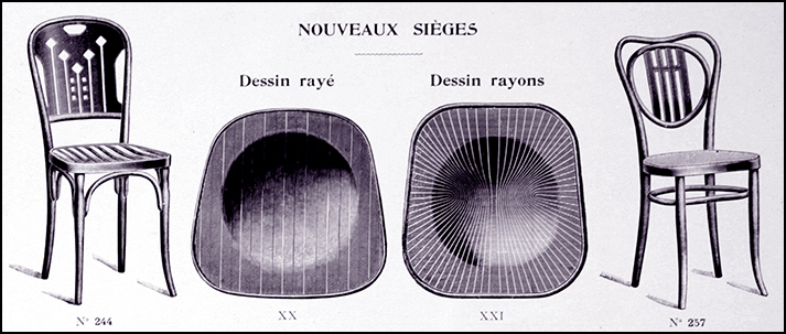Lo interesante de este establecimiento a efectos de este blog es la presencia de dos modelos distintos del fabricante de Moravia, Kohn, en diferentes espacios. Por un lado una aparentemente sencilla silla de aire clásico y rectilíneo que es el nº 324 del catálogo. Digo que es sencilla «aparentemente» porque se trata de uno de los ejemplares de la patente de la curvatura en «ángulo recto» obtenida en 1898, que se manifiesta en el diseño rectangular de una sola pieza de patas traseras y respaldo así como en el diseño y construcción en la misma forma del asiento. Con este sistema de curvatura el fabricante de muebles se adaptaba y facilitaba al mismo tiempo la evolución estilística del mueble vienés hacia formas y estructuras más rectas y alejadas del Art nouveau, manteniendo los mismos procedimientos técnicos perfeccionados. La silla apareció en el catálogo en 1902 pero su ilustración con la referencia de la patente que reproducimos es del catálogo para los Estados Unidos y Canadá de 1909.