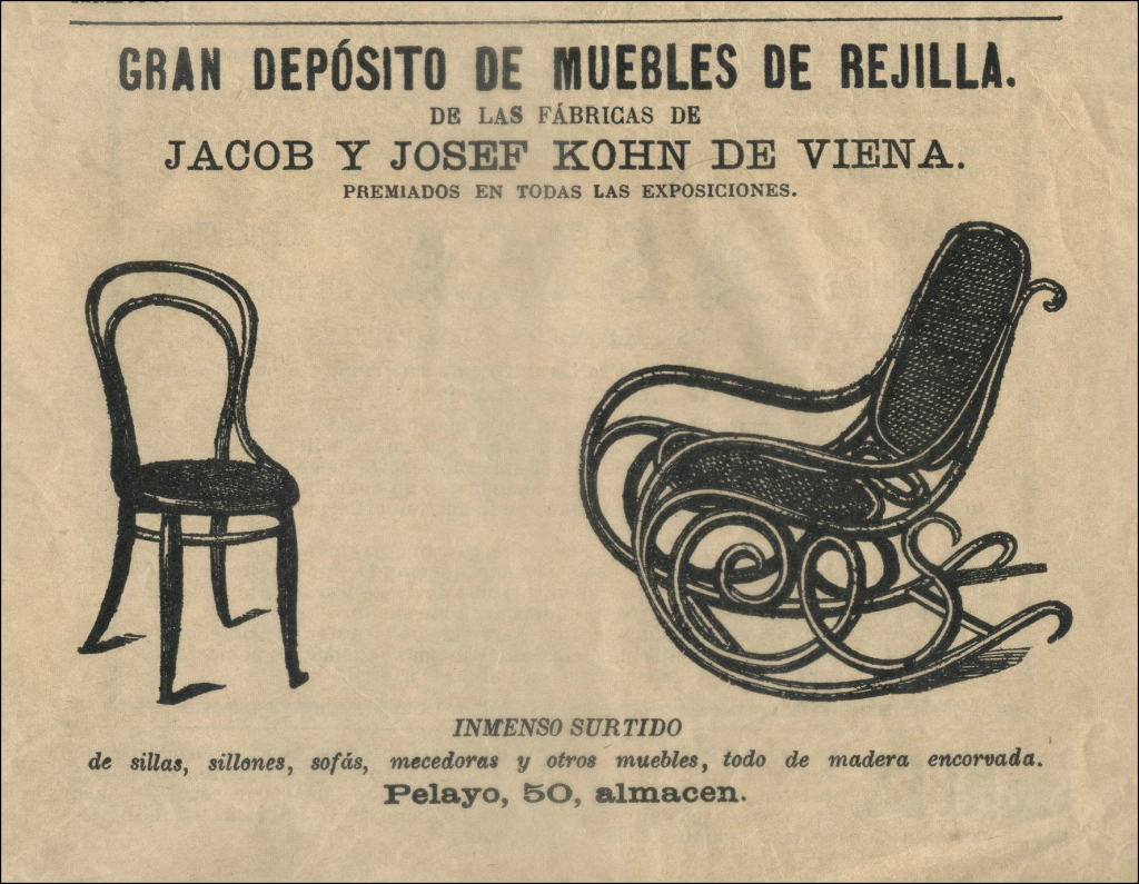 Es en las mecedoras donde pueden verse lazos que cumplen una función estructural además de decorativa. Casi todos los fabricantes tenían algún modelo en el que los laterales tenían lazos y aquí sólo ponemos algunos ejemplos. Fue muy apreciada en Barcelona la mecedora número 11 de Jacob & Josef Kohn, probablemente porque el vendedor Baldomero Martínez (calle Pelayo número 50), la publicitaba con frecuencia y la misma casa Kohn la ilustraba en los anuncios del diario La Vanguardia de 1881. Había unos cuantos ejemplares de esta mecedora en el Hotel Internacional que concibió Domènech i Montaner para la Exposición Universal de Barcelona de 1888.