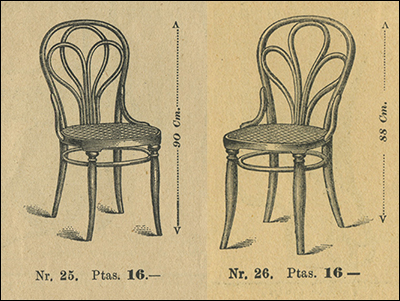 Con funciones de refuerzo patentó Ventura Feliu en 1904 una traba para sillas en forma de doble lazo que quizá tiene también algo de forma de pajarita. La traba fue muy popular -incluso en Barcelona había sillas con ella en el salón de lectura de los Grandes Almacenes «El Siglo»- y fue un signo distintivo de su mobiliario durante muchos años.