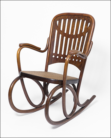 Una mecedora también muy potente en el sentido estructural es la número 71 -también de Hermanos Thonet- aparecida en 1905 y en la que dos gruesas barras laterales continuas, con lazos en posición invertida, son las protagonistas visuales de la pieza, a la que dan un dinamismo extraordinario, y hace que se asocie en ocasiones esta mecedora a las formas del Art nouveau.