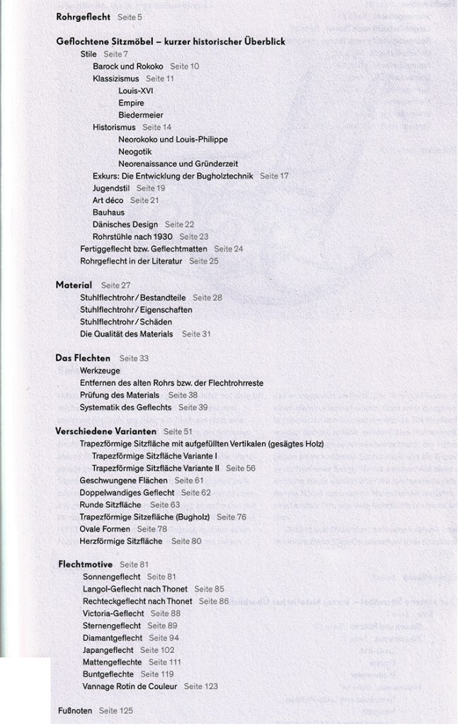 El libro tiene 126 páginas, la mayoría bien ilustradas con dibujos de las rejillas, sus tipos, geometrías y diseños, los procedimientos, los acabados y las técnicas empleadas. El volumen I se divide en 6 partes: introducción histórica a los muebles de asiento tejidos, el material, el trenzado, variantes, motivos trenzados y notas finales (118 notas).