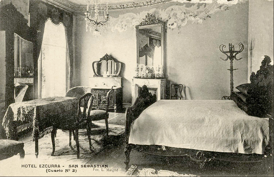 También es visible el perchero de Fischel en el famoso Hotel Ezcurra de San Sebastián, donde se encontraba al menos en una habitación. Sobre este Hotel ya hicimos una entrada sobre las sillas del restaurante, las famosas número 511 de Hermanos Thonet. Pero el perchero de Fischel también estaba, al menos en el «cuarto nº 2» que debía ser una habitación de lujo.