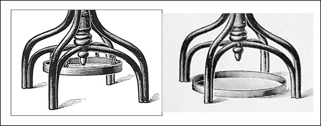 Pero en realidad el perchero de Fischel es también paragüero (y bastonero, no se olvide). Una peculiaridad de los modelos más tempranos, al menos hasta 1910 (nueva numeración 102 HS), es que la bandeja de latón que se usa para recoger el agua del paraguas está no en el suelo, sino suspendida debajo del perchero con unos enganches. Se supone que de este modo podía moverse todo el conjunto a la vez, sin tener que desplazar en otro acto la bandeja del agua. Un curioso detalle.