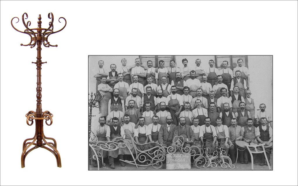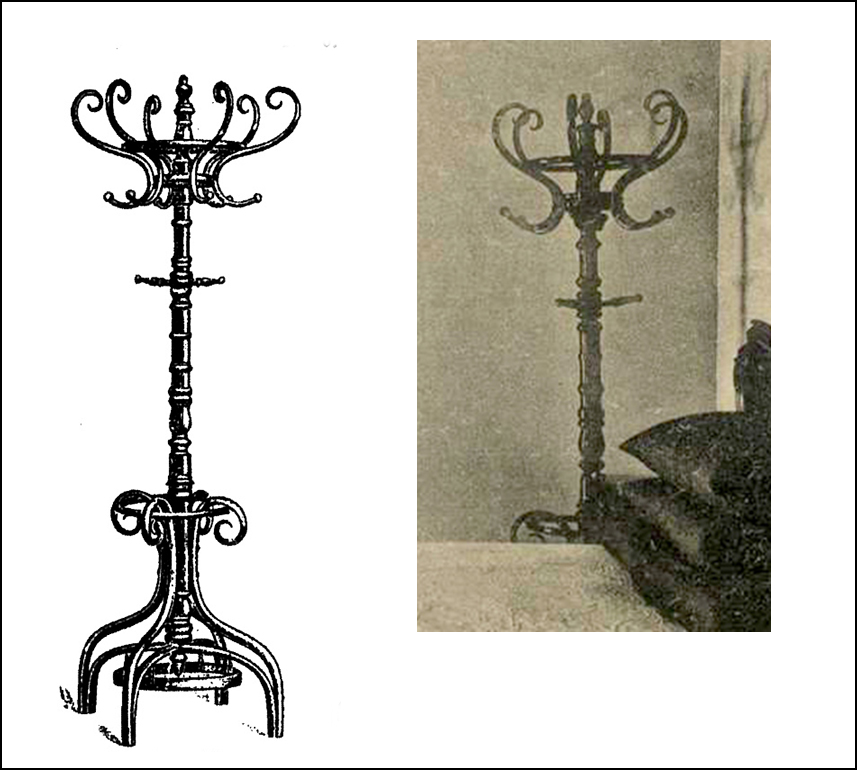 En concreto el perchero era un mueble emblemático y algo sofisticado de la firma. Se fabricó al menos entre 1889 (primer catálogo conocido) y los años veinte. El marco conceptual -como se dice pomposamente- es el perchero de Hermanos Thonet (todavía está por demostrar documentalmente que el famoso por todos conocido «perchero Thonet» no sea en realidad un «perchero Kohn», pero de momento se acepta la tesis por respeto a la tradición). Sin embargo el modelo de Fischel tiene algunas características diferenciales.
