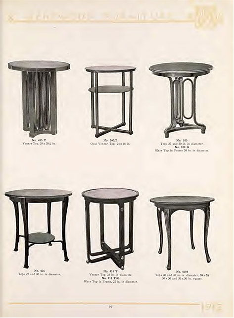 Otras características del catálogo son, aparte de la ausencia de camas y mueble grande como armarios, escritorios, consolas, etc. la abundancia de modelos tapizados o con piel, más del gusto de los ambientes fríos de los Estados Unidos y Canadá, en comparación con la rejilla, las sillas altas para mostrador y las sillas ajustables en altura y giratorias de oficina, los percheros y paragüeros, mobiliario infantil y de juguete, con abundancia de modelos de sillas infantiles de comer, mesas -con estructura no siempre de madera curvada- pero también de aire moderno como las que muestra la siguiente ilustración.