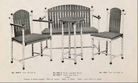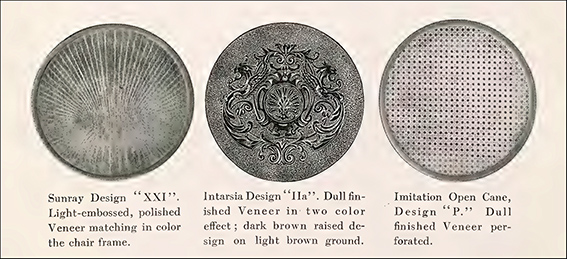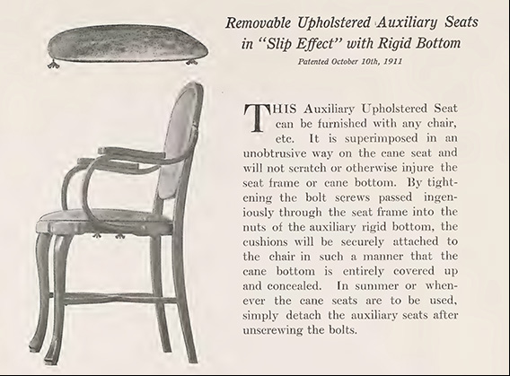 Una novedad que nos ha parecido interesante es la de un popular taburete modernista que dispone de un asiento reversible: rejilla en un lado y chapa de madera en el otro (p. 72, modelo 616R). Esta búsqueda de la multifuncionalidad también se aprecia en el catálogo en el invento -patentado en 1911- de un asiento auxiliar rígido y tapizado pensado para el invierno, que puede colocarse encima de la rejilla sin dañarla. La indicación del catálogo dice que basta con atornillar la pieza y puede desatornillarse cuando llega el verano, suponemos que para disfrutar de la ventilación que proporciona la rejilla.