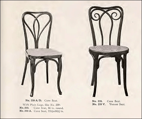 Sólo vamos a comentar los modelos de mobiliario más destacados. Estos pueden clasificarse en curvado clásico -estilo netamente Thonet, diríamos-; estilo historicista (neogótico -p. 66- o neorenacentista -p- 29) e inglés, que rebosa en la mayoría de los pies delanteros de los asientos en el estilo «Reina Ana» o pata cabriole; curvado en forma rectangular (p. 41, fila inferior), derivado de la patente de Kohn de 1898 y que tanta relevancia tenía en el catálogo para los Estados Unidos y Canadá de 1909; curvado con juntura cuádruple de respaldo y asiento (patente de 1877, por ejemplo en sillas tan conocidas como las número 30 y 36); modelos de estilo Secession y, finalmente, sillas curvadas editadas exclusivamente para los Estados Unidos y populares que no se han visto en ningún catálogo europeo como los que se ven en la ilustración siguiente.