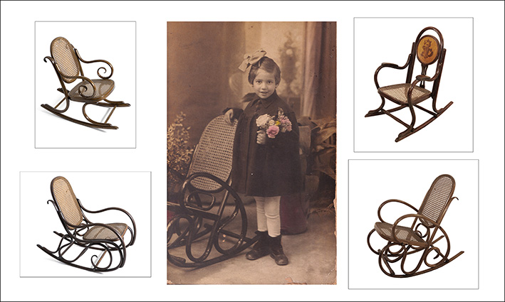 Como tarjeta de presentación escogimos este retrato antiguo de una niña con un ramo de flores al lado de una mecedora infantil fabricada por Alejandro Parra, de Valencia. La imagen es obra del estudio fotográfico de Alejandro Quiles, de Catarroja. Aparece rodeada por cuatro de las mecedoras que pueden verse en la exposición.