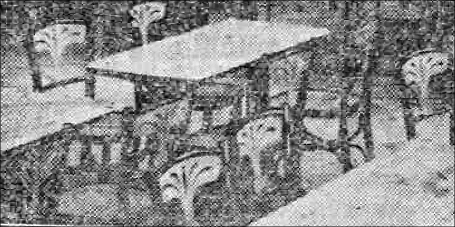 Si las mesas también eran de Luis Suay, como indican las crónicas, serían -por lo que hemos podido observar- las mesas de café para poner mármol como las del fabricante vienés Kohn que aparecen en el catálogo mencionado de Suay. Sólo Ventura Feliu e Hijos -a nuestro conocimiento- hacía el sobre de esta mesa ondulado.