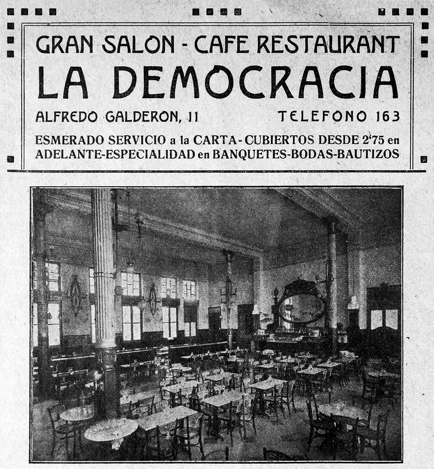 El otro local era llamado «Café de la democracia», un título que hoy veríamos adecuado para una serie o una tertulia de la televisión. Era el Café de la Casa de la democracia. La Casa de la democracia, inaugurada el 15 de febrero de 1914, en la calle Alfredo Calderón (otro escritor y periodista republicano, fallecido en 1907), número 11, no sólo tenía un interés político, social y cultural -además de por el café claro- sino también arquitectónico, como nos explica Ramón Martín Pérez en su blog, refiriéndose a la obra del arquitecto Francisco Mora Berenguer: