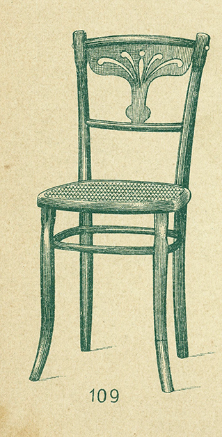 La silla del Café «la democracia» era el modelo número 109 del catálogo de Suay de 1910 ca. Una silla sencilla, ideal para un café, y con una vistosa chapa calada en el respaldo como motivo decorativo de estilo vegetal. En el catálogo la silla aparece ilustrada con el típico aro de refuerzo entre las patas pero las del café llevaban la traba Suay.