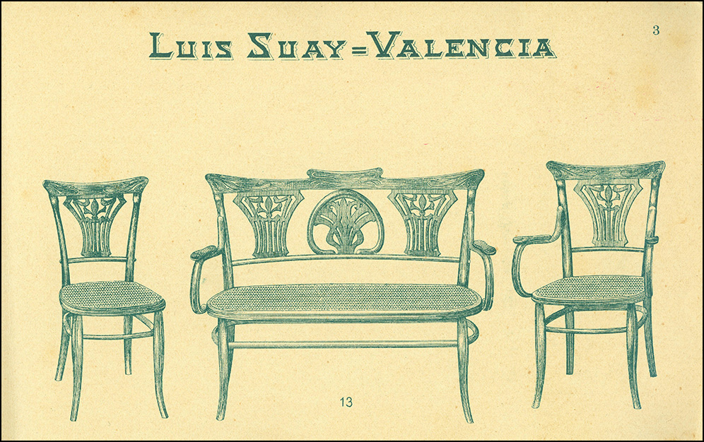 En matèria de moble de Viena, vienés o valencià, els catàlegs són eines primordials en la identificació del mobiliari que es fabricava. El model del museu Cerdà solament el feia exactament Luis Suay -pel que podem saber- i, per tant, s’ha d’atribuir a aquest fabricant valencià. Per sort tenim una còpia del catàleg de principis del segle XX de l’Arxiu Valencià del Disseny d’aquest productor de moble corbat on surt el mateix moble en un conjunt amb cadira i butaca.