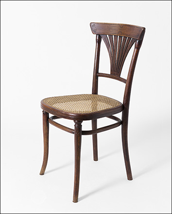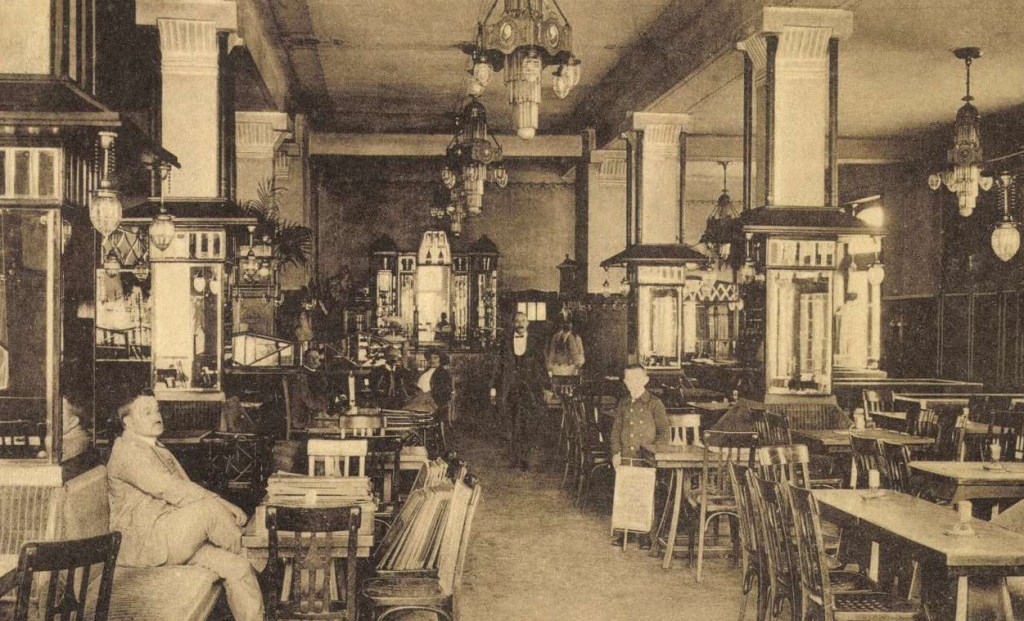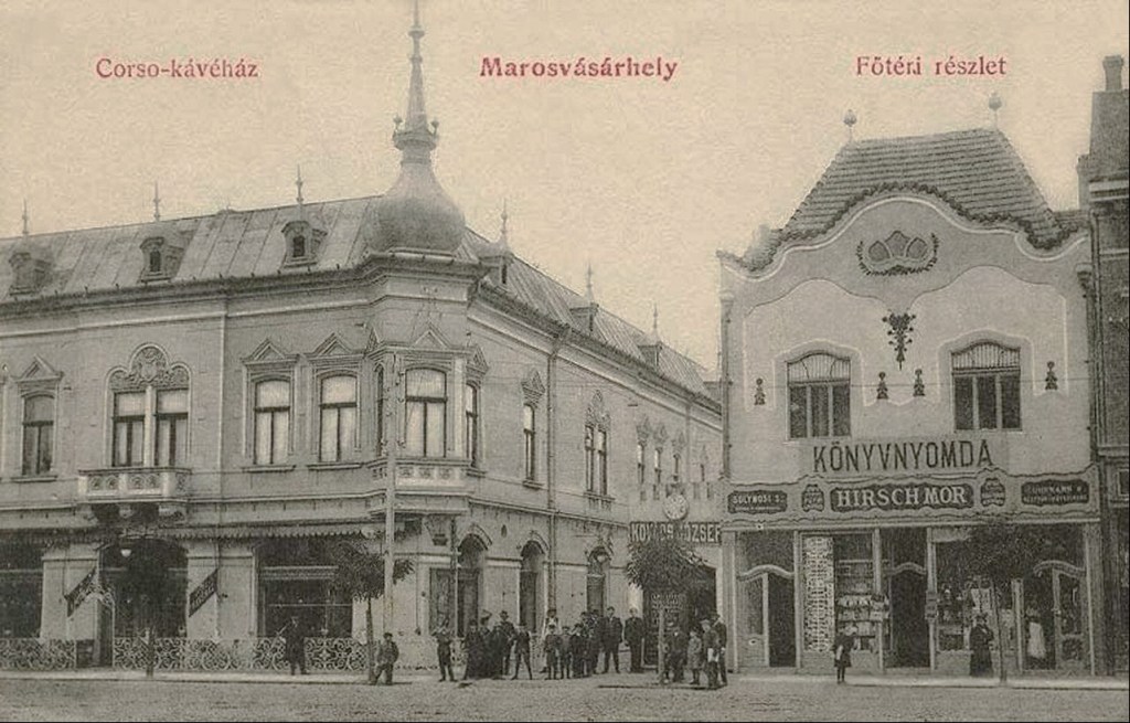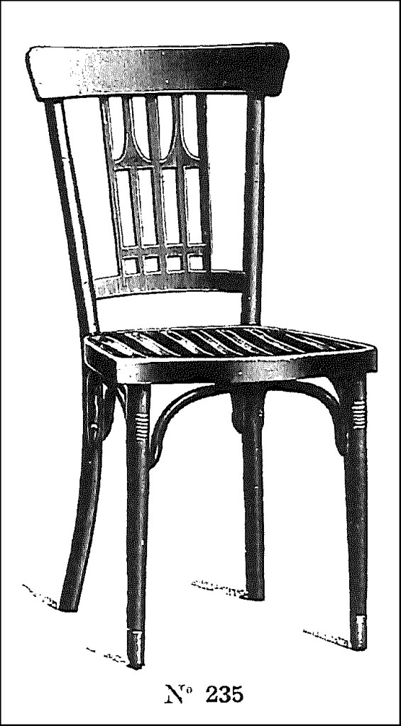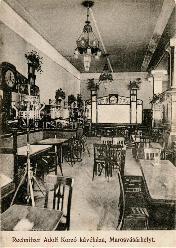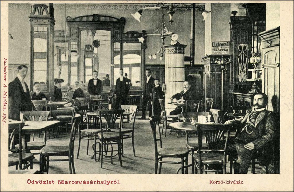 Marosvásárhely (húngaro)/ Targu Mures (rumano) es una ciudad de Rumanía con importante población húngara. Ya hicimos una entrada sobre el café del Hotel Royal de esta localidad. Instalado en un palacio de origen barroco, el Café Corso se inauguró en 1904, en unos años cuando todavía tenía fuerza el Art nouveau. Recientemente el edificio ha sido replicado y pueden leerse unas líneas de su historia con imágenes en el blog: https://blog.skanzen.hu/2022/01/29/a-korzo-kavehaz-tortenete/. En las postales que hemos visto del café Corso, particularmente en la página https://en.mandadb.hu/tetel/475447/Korzo_Kavehaz__kepeslap_Marosvasarhely_1907 se aprecian dos fases, al igual que ocurría en el Café Royal: una inicial, claramente Art nouveau, en la iluminación y el trabajo de carpintería, y otra a partir de 1908 aproximadamente con otra decoración, más moderna, y sillas con formas Secession. En los primeros años, las sillas eran las usuales Art nouveau, con hoja de palmera en el respaldo y el detalle, residuo del historicismo, de un pequeño capitel en la unión de las patas delanteras con el asiento. Este modelo -número 221 del catálogo- lo introdujo Hermanos Thonet en el mercado en 1898 y fue copiado e imitado por casi todos los fabricantes de madera curvada conocidos, por su popularidad. En Barcelona eran de este modelo -Hermanos Thonet nº 221- las sillas del Restaurant del Apeadero del Paseo de Gracia.