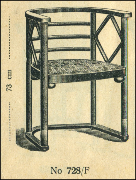 En la segunda época las sillas son, posiblemente, de Jacob & Josef Kohn -con seguridad no son de Hermanos Thonet- con los característicos arcos entre las patas en vez de anillo -innovación de la casa Kohn también seguida en cierta medida por los otros fabricantes-, y la flecha en el respaldo. No hemos encontrado en los catálogos de Kohn exactamente este modelo de silla con una sola flecha en el respaldo pero este fabricante comercializaba sillas con tres y dos flechas y no sería extraño que hiciera también un modelo con una flecha. A veces se atribuye a Koloman Moser este diseño porque el artista y decorador vienés amigo de Hoffmann utilizó este motivo ornamental en otros objetos y muebles. Un dato que se puede añadir a la procedencia de Kohn de las sillas es que, examinada la postal en detalle, en el lado izquierdo, se aprecia la presencia en el café de sillones número 728 de Kohn, que se atribuyen habitualmente a Josef Hoffmann.