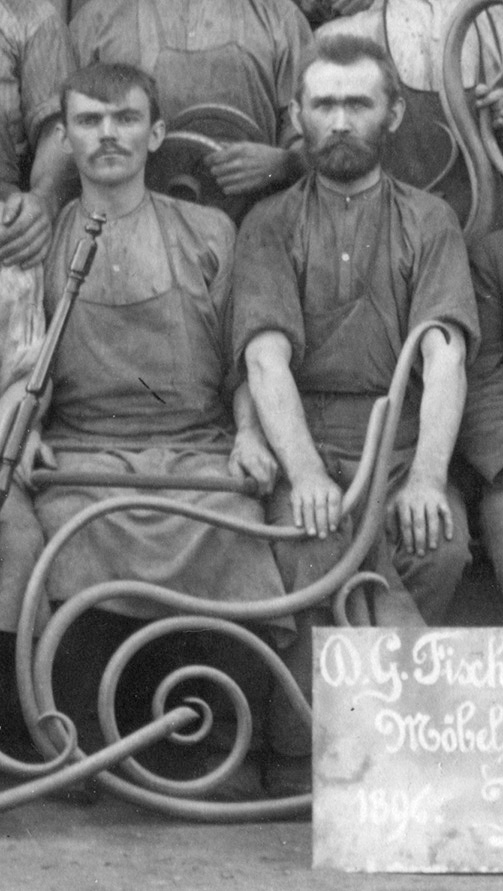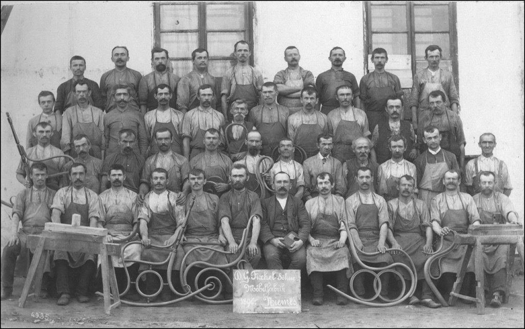 En un magnífic àlbum dels treballadors i treballadores de Fischel de 1896 es pot veure un grup d’ells amb peces de fusta corbada entre les quals hi ha un lateral d’un balancí número 1 B el qual respon perfectament a les característiques assenyalades.