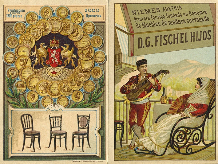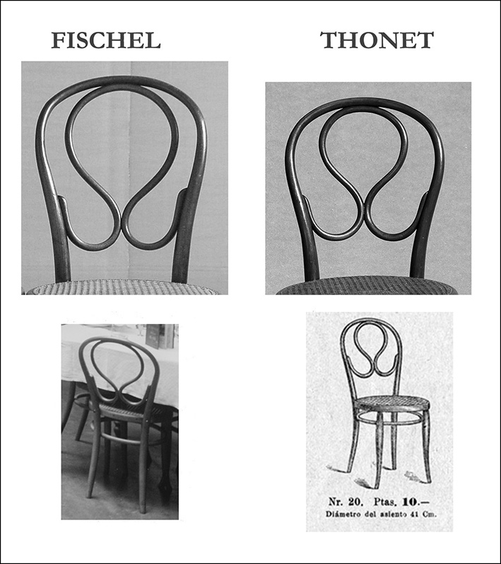 Fills de D. G. Fischel. Els principals fabricants de moble de Viena d’Àustria-Hongria eren Germans Thonet, l’anomenat fundador de la indústria del moble corbat, Jacob i Josef Kohn i Fills de D.G. Fischel, uns o altres amb representació a Barcelona entre 1875 i 1920 aproximadament. Fischel tenia la fàbrica a Niemes (actualment la localitat es diu Mimoň, a Txèquia) i ja va participar, extingida la patent de Germans Thonet, a la important l’Exposició Universal de Viena de 1873. [https://www.historiemimone.cz/products/fischelova-tovarna/]