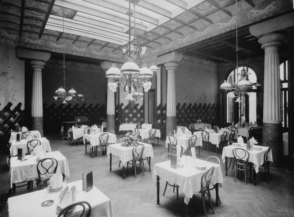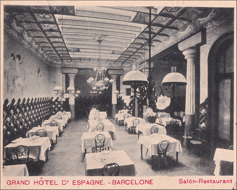 Les cadires del menjador dels hostes. En la reforma que va fer Domènech i Montaner de la Fonda Espanya (1900-1903) es van introduir – o potser ja hi eren abans?- en el menjador dels hostes cadires corbades número 20, (portava al catàleg de Fischel també aquest número el model que havia dissenyat originalment Germans Thonet). En el restaurant de la Fonda, un espai diferent, les cadires no eren de fusta corbada. Presentem les tres imatges conegudes de l’època del menjador dels hostes a continuació, amb les mateixes cadires.