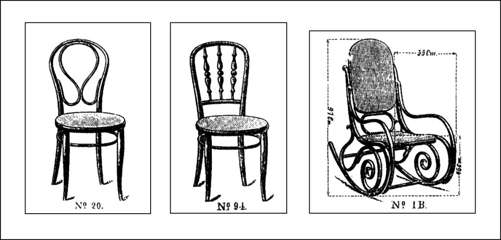 La primera il·lustració que tenim d’aquesta cadira núm. 94, anterior a la del catàleg de 1889, és d’un prospecte de la firma repartit durant l’Exposició Universal de Barcelona de 1888 on es mostra amb altres cadires amb el típic tornejat característic de Fischel i un balancí chaise-longue sobre el que ja hem fet una entrada en aquest blog (puntualitzem que no consta que estigués aquest model de chaise longue-balancí a la Fonda Espanya).[https://muebledeviena.com/2018/11/03/la-mecedora-regulable-no-25-de-hijos-de-d-g-fischel/].