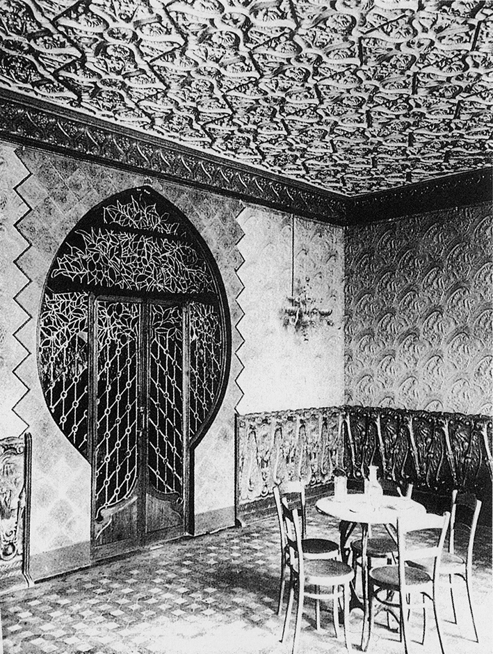 Se conservan muchas imágenes del interior en las que puede apreciarse la decoración modernista y certifican que se hacían grandes banquetes y celebraciones suculentas diversas que ya forman parte de la historia festiva de la ciudad. En algunas fotografías de principios de siglo pueden apreciarse bastante bien las sillas del establecimiento, de madera curvada. Las mesas no estaban producidas con la técnica de la madera curvada. De todos modos eran unas sillas de madera curvada sui generis, sin mucha continuidad lineal, con respaldo y asiento de chapa grabada, que empezó a ponerse de moda a principios de la década de 1890 entre los fabricantes de mueble curvado como Hermanos Thonet. Esta técnica del contrachapado grabado -o perforado- permitió al mueble curvado adaptarse estilísticamente en lo decorativo a las tendencias del Art nouveau, abundando los motivos florales en los diversos tipos de grabado: con relieve, el llamado impropiamente «intarsia», dos colores, etc.