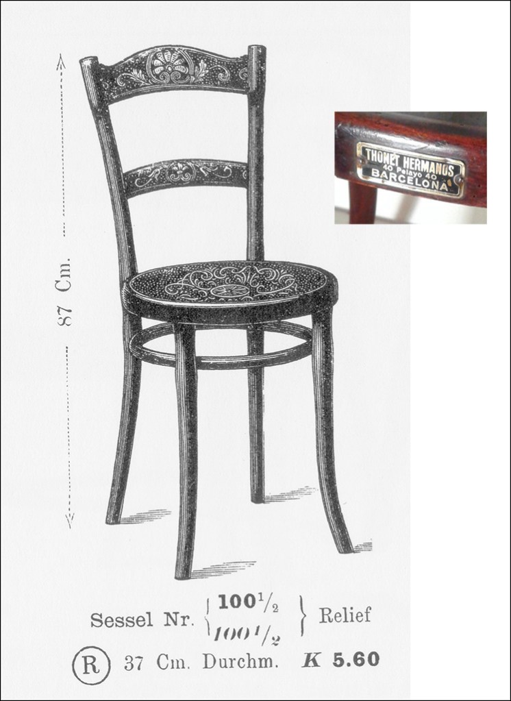 Las sillas del Café Restaurante eran muy probablemente el modelo número 100 (o el número 100 1/2 si el asiento era de 37 cm. en vez de 42 cm. de diámetro) de Hermanos Thonet, aparecido en el catálogo de 1895. Tenían una decoración de tipo floral grabada en relieve en el respaldo y en el asiento. Curiosamente en las imágenes del interior del Restaurante, si se ven un poco ampliadas, se ve la chapa metálica que ponía la tienda de Hermanos Thonet de Barcelona en la parte trasera del asiento de sus sillas, práctica que no seguían los otros vendedores de la ciudad de muebles de Viena como de Kohn o de Fischel, por ejemplo. Aunque, como se sabe, esta placa por sí sola, no es suficiente para certificar que un mueble es de Hermanos Thonet, sí es un indicio de autoría que debe corroborarse con imágenes de catálogos (al menos cuando, como es el caso, no se tiene un ejemplar del mueble delante para ver etiquetas y/o inscripciones). Como referente de este modelo de silla, cabe señalar que también se encontraba en el Bar Torino de Barcelona, inaugurado el mismo año de 1902. ¿Tenía la decoración de la silla un cierto aire modernista neo-árabe, en opinión de los propietarios que la utilizaron o era sólo una casualidad?
