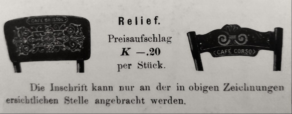 Lo que resulta interesante -y extraño- en las sillas del Restaurante del Tibidabo -no lo hemos visto antes ni en la realidad ni en imagen- es la particularidad de la pieza -o tramo- algo rectangular que se encuentra añadida debajo de la pala del respaldo. Este pequeño detalle de la silla lo ofrecía Hermanos Thonet desde 1899 con la idea de poner allí, si se quería, el nombre del café, hotel o restaurante de que se tratara, como se muestra en una ilustración del mismo catálogo. La idea es que al poner el nombre del establecimiento no quedara tapado el grabado decorativo. Las sillas del Gran Café-Restaurante del Tibidabo estaban diseñadas de este modo pero no hemos podido apreciar en las imágenes si el nombre estaba grabado en el lugar previsto del respaldo para ello. Sería lo lógico porque el detalle implica un aumento del precio de la silla. Una incógnita. ¿Alguien ha visto una silla del establecimiento del Tibidabo en la que estuviera grabado su nombre…o no? Quizá el nombre completo no cabía o quedaba demasiado pequeño. Quién sabe.