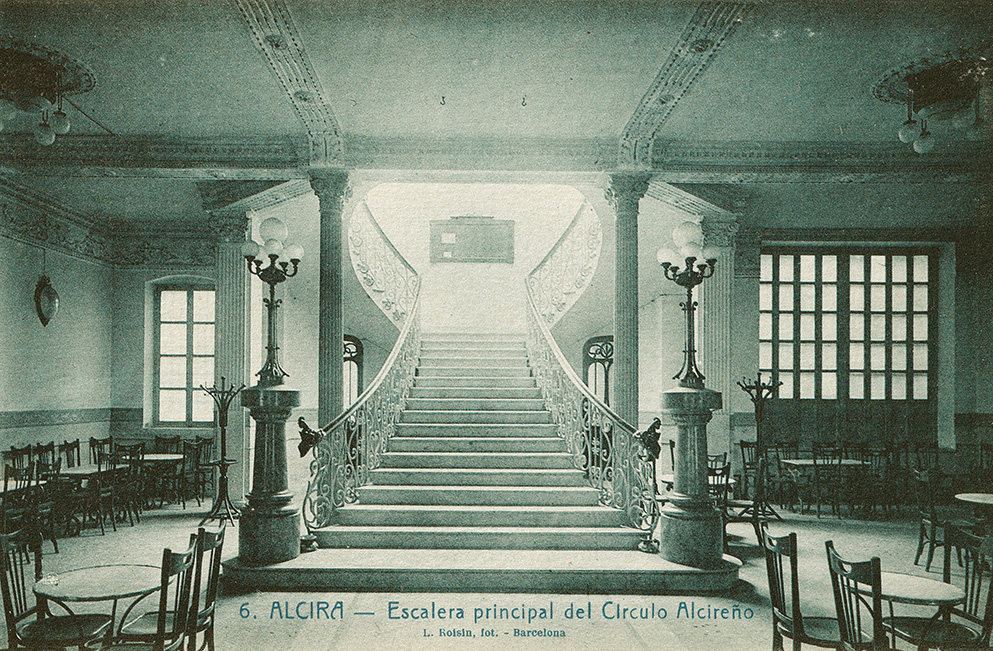 La conocida por su origen como «Gallera de Alzira» (se llamó «Gran círculo gallístico» por las peleas de gallos que se celebraban desde 1872) es actualmente, y desde 1883, el Círculo Alcireño (Cercle Alzireny). Promovido en su día por la pujanza de la agricultura de la localidad es hoy un club social y cultural donde se celebran eventos sociales, presentaciones literarias, reuniones de asociaciones y exposiciones. Tiene una merecida y detallada entrada en Wikipedia porque es un Bien de Relevancia Local y muestra interesantes salones modernistas de inspiración valenciana y árabe. Destaca en el vestíbulo la gran escalera decorada ricamente con un elegante pasamanos que Kohn lo habría podido hacer de madera curvada.