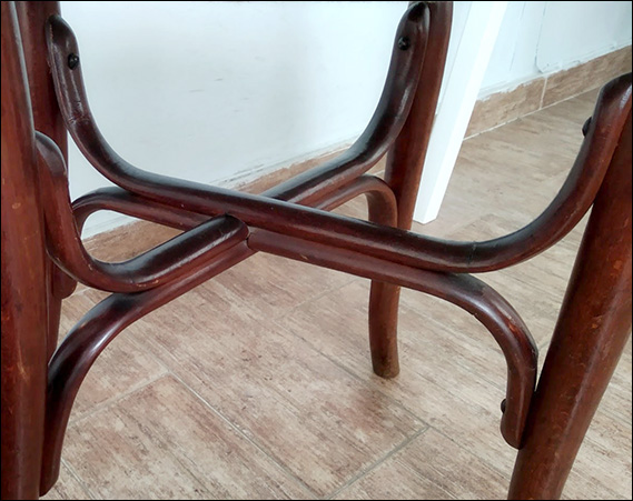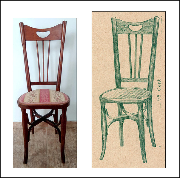 Se trata de un modelo de Silla de Luis Suay, importante fabricante valenciano de muebles curvados. Concretamente en su catálogo de en torno a 1910 aparece como el número 71. Presenta una ondulación en la pala ahuecada del respaldo, rematada con tres barras -una vertical, dos inclinadas- y destaca también la concurrente ondulación del asiento oval en la parte delantera, asiento fabricado en contrachapado. Una bonita silla que se encontraba también en los años veinte en el Café de la Marina de San Sebastián. [https://muebledeviena.com/2022/04/09/el-cafe-de-la-marina/] El asiento de chapa podría ser tapizado como es el caso del ejemplar de esta silla que se encuentra en el Espai corbat de la Fundació Caixa Vinaròs. No nos consta que subsista algún ejemplar de estas sillas en el Círculo actualmente y no es un modelo fácil de encontrar.